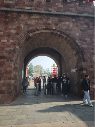 随后,师生前往洛邑古城。这座以洛阳隋唐古城为原型打造的街区,将仿古建筑与现代商业、文化业态深度融合 —— 隋唐风格的城楼、依水而建的廊桥、搭配传统灯笼的建筑立面,既保留了古建形制,又满足了当代使用需求。同学们以 “建筑功能与时代需求的适配” 为调研重点,分组记录不同区域的建筑设计:商业街区的 “前店后展” 布局、文化体验区的 “开放式庭院” 设计、水系与建筑的互动关系,都成为大家速写与拍摄的重点。部分同学还专门调研游客动线,分析 “古建风貌与现代人流疏导” 的结合方式,为后续课程设计积累灵感。