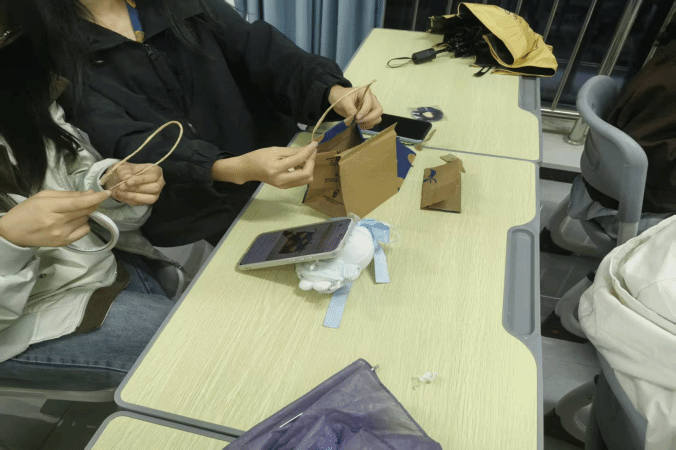 活动伊始,主持人围绕“绿色行动”主题,结合PPT和实物案例,详细介绍了手工造盒的设计原理与制作技巧,为同学们的创作提供了灵感。随后,同学们两人一组,利用旧物材料动手制作收纳盒。在巧手改造下,原本闲置的材料焕然一新,成为兼具美观与实用功能的手工作品。