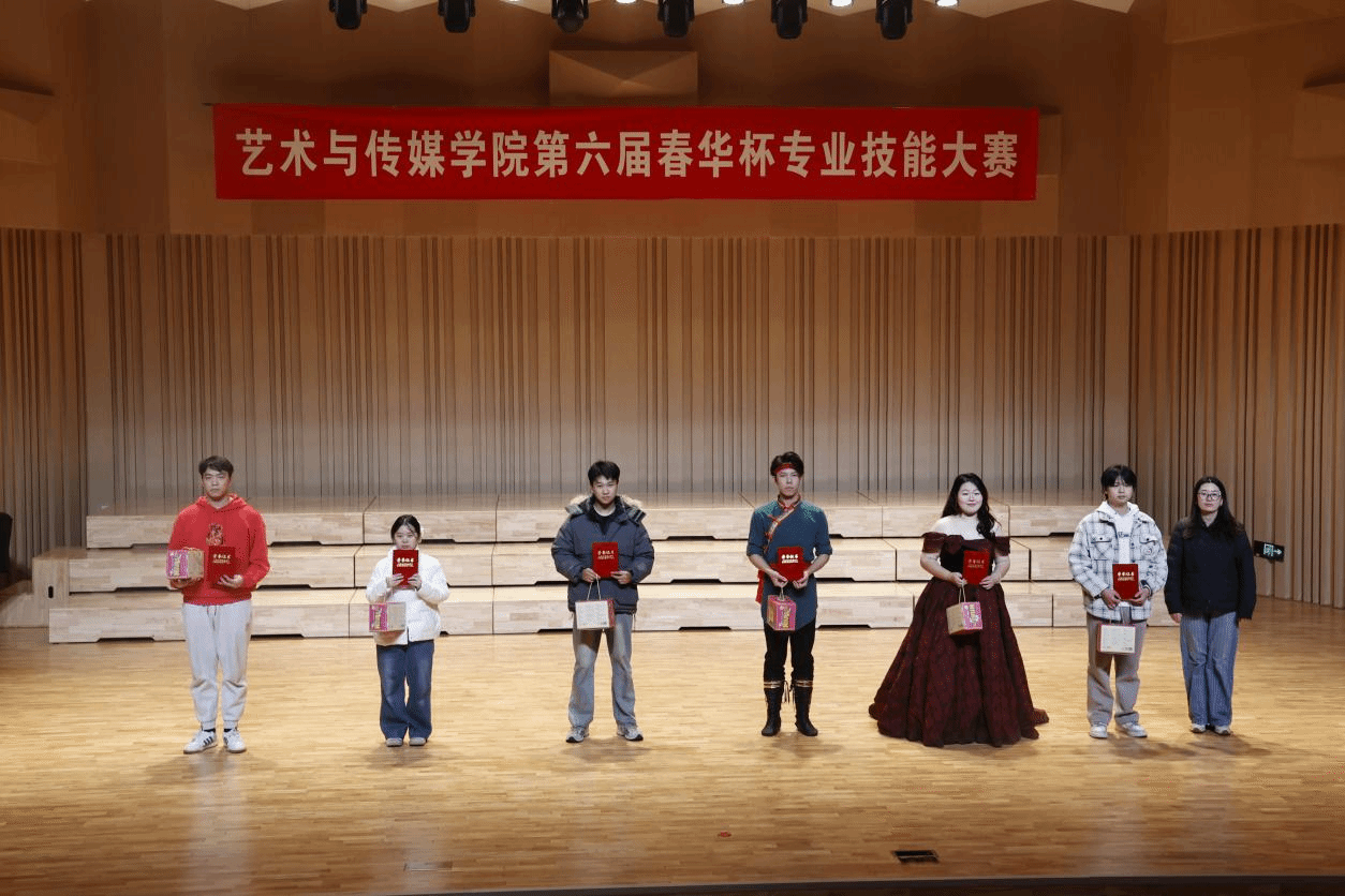 2025年11月25日晚,艺术与传媒学院第六届“春华杯”专业技能大赛颁奖典礼暨优秀作品汇演在学院音乐厅隆重举行。本次活动以“聚力·赋能·成长”为主题,由艺术与传媒学院主办、学院学生会承办,旨在全面展示学生的专业素养与艺术才华,推动美育教育与专业实践的深度融合。