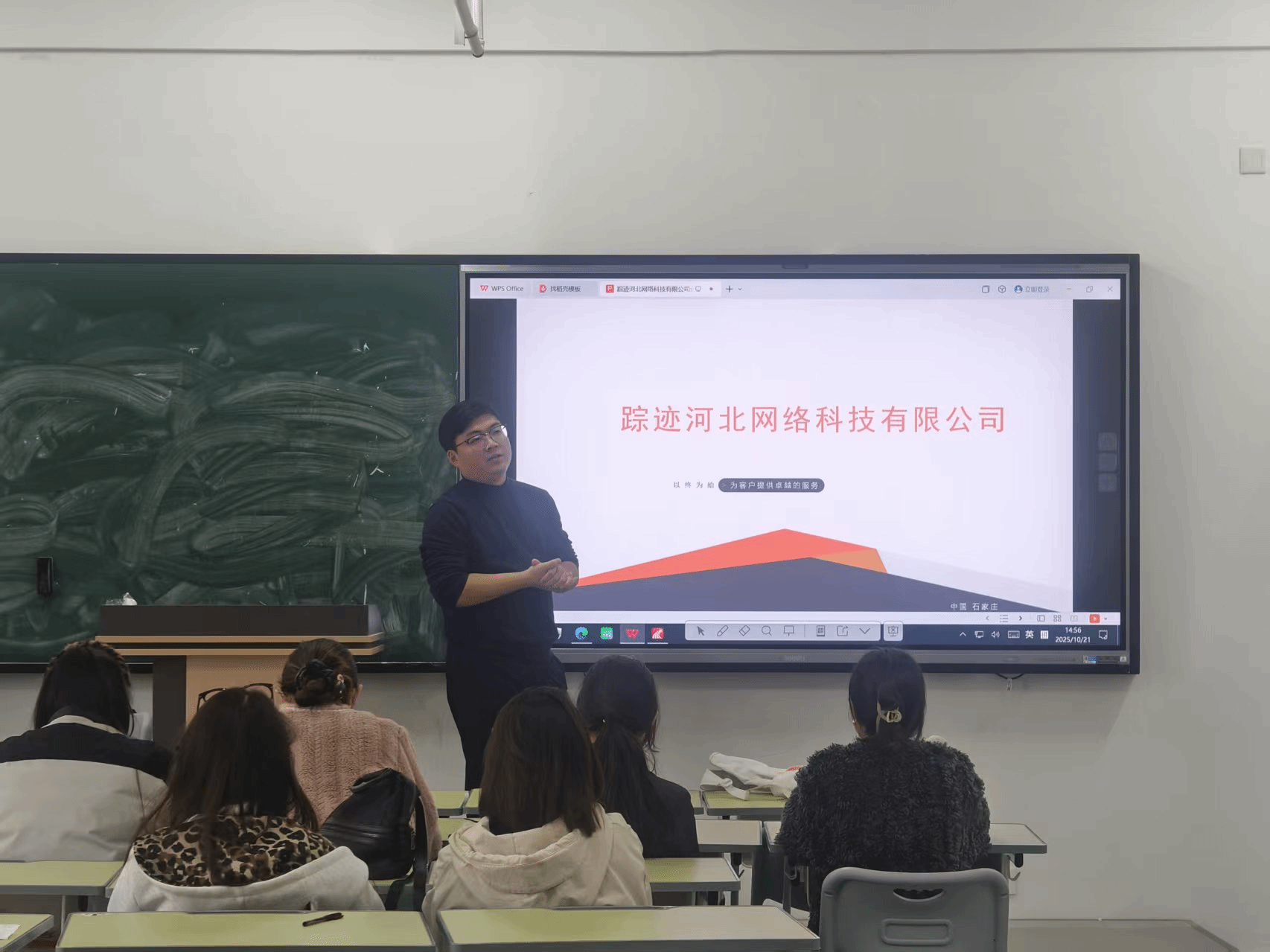 宣讲会上,踪迹河北网络科技负责人详细介绍了公司发展历程、核心业务与广阔前景,着重阐述了艺术与传媒领域在公司的关键地位及多元岗位需求,涵盖设计、新媒体运营等多个方向,让同学们对就业方向有了更清晰认知。