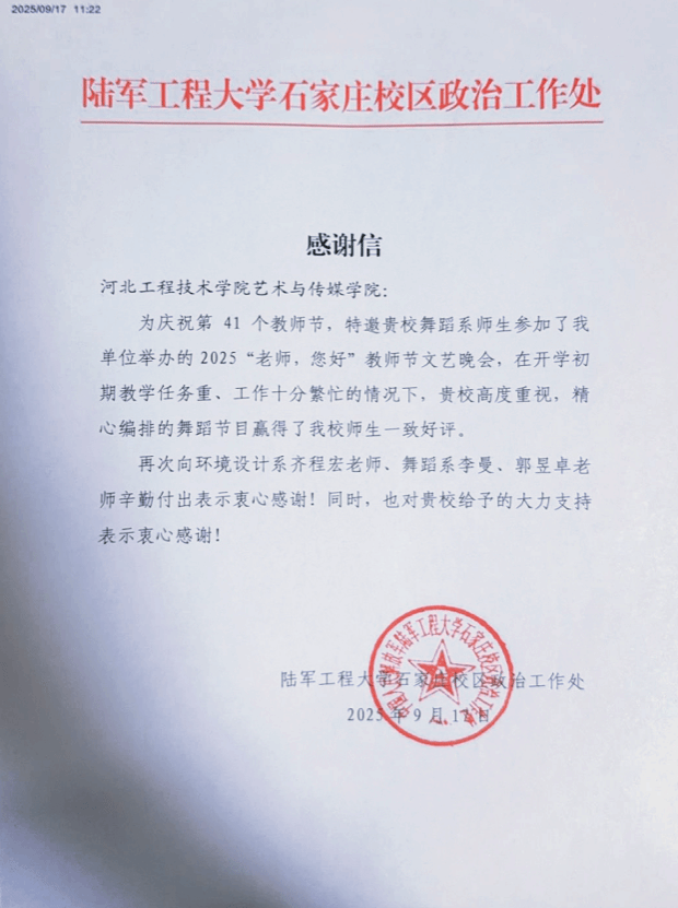 9月23日,陆军工程大学专程来到我校,为艺术与传媒学院赠送锦旗并送上感谢信,对学院师生受邀参与该校教师节表彰大会暨文艺演出活动,表达了诚挚的感激之情与高度的赞扬之意。