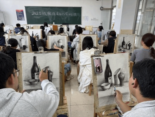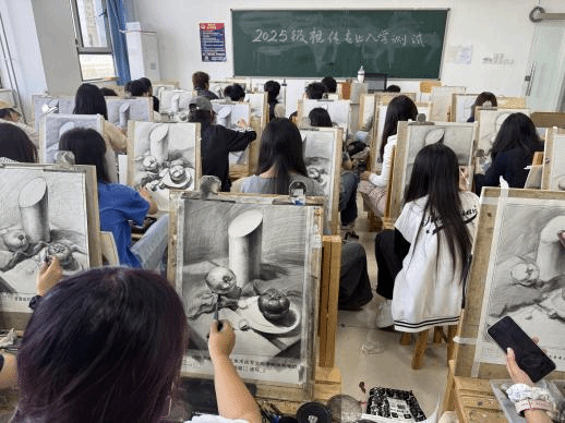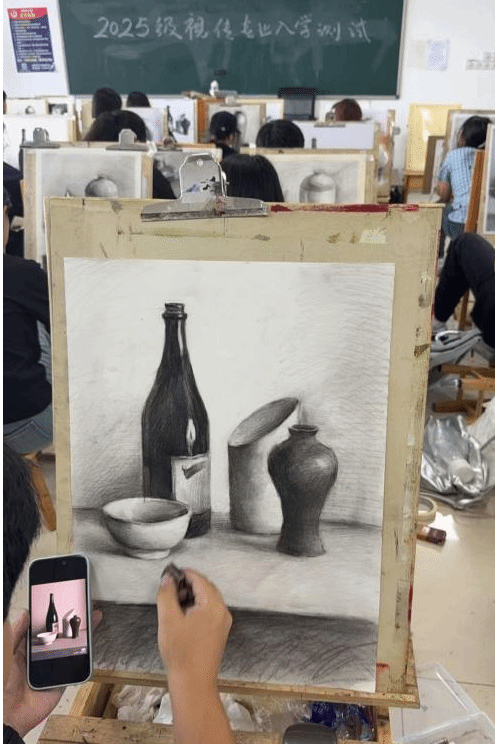 测试当天,2025 级视觉传达设计专业 1-6 班的全体新生早早来到考场,有序领取绘画工具,快速进入创作状态。考场上,新生们或俯身观察静物细节,或提笔勾勒轮廓线条,或用炭笔细致调整明暗层次,专注的神情与认真的态度,展现出对视觉传达设计专业的热爱与追求。大多数同学能够快速找到创作节奏,从整体构图入手,逐步细化物体的质感与光影变化。测试过程中,专业教师巡回观察,实时记录新生的创作思路与基础水平,为后续教学分析积累第一手资料。不少教师表示,从现场创作情况来看,2025 级新生整体具备较好的艺术感知力,部分新生在造型准确性与画面层次感表现上尤为突出,展现出较强的专业潜力。