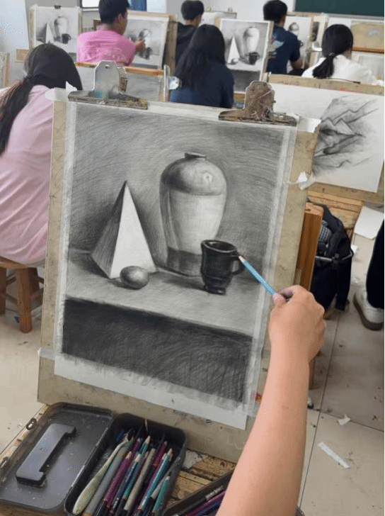 为确保测试的专业性与公平性,学院提前成立了由视觉传达设计专业教研室主任牵头,专业基础课教师5人组成测试工作小组。从测试内容的确定、考场的布置,到评分标准的制定,均经过多轮研讨与细化。测试内容聚焦素描造型基础核心能力,以 “静物组合写生” 为主题,要求新生在3小时内完成作品,重点考察其对物体形态、比例、透视、明暗关系的观察与表现能力,以及对素描工具的基础运用技巧。