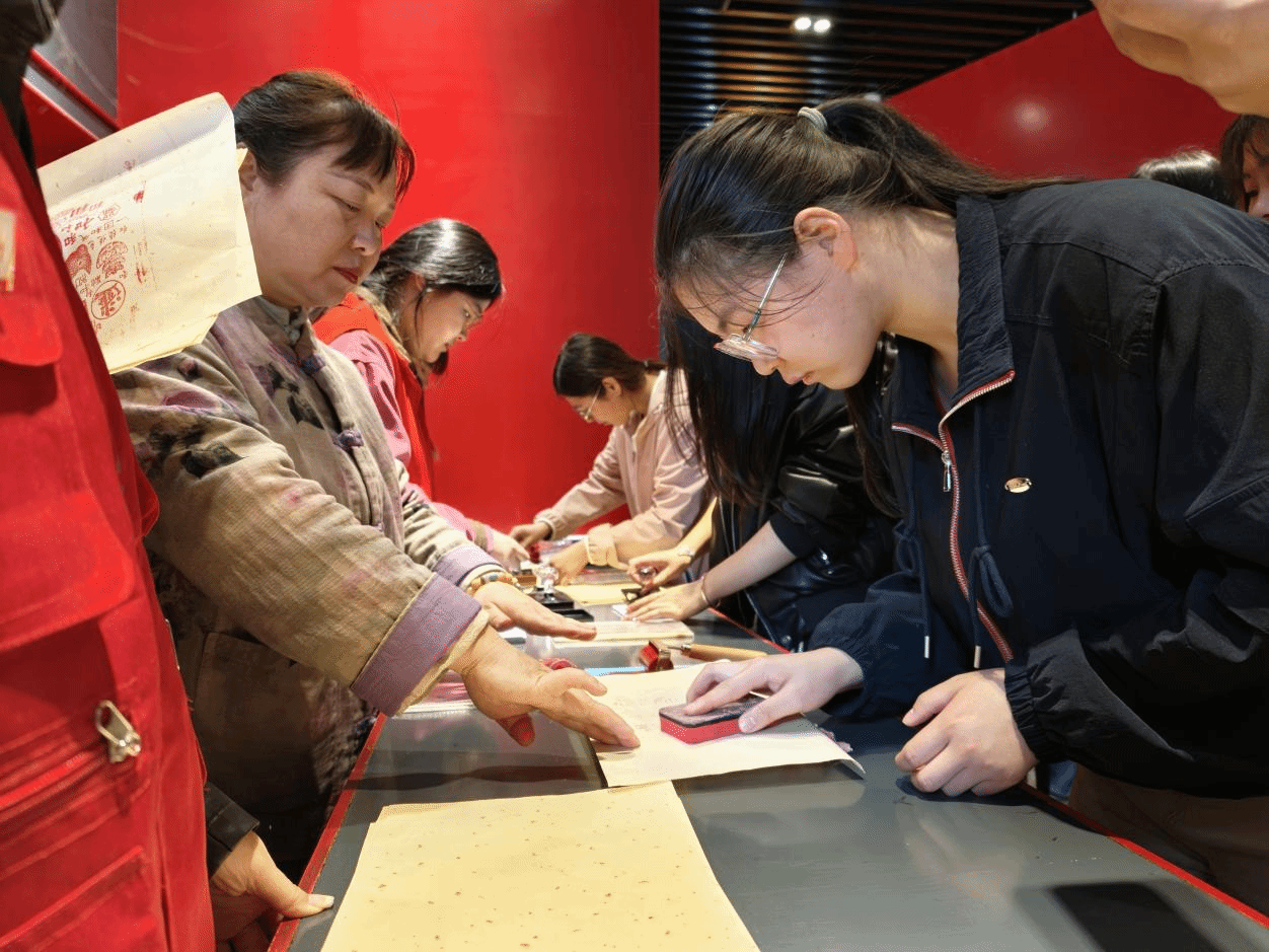 参观结束后,师生们在赵佗纪念馆前参与了国家级非物质文化遗产——活字印刷术的体验活动。在非遗传承人的指导下,同学们亲手刷墨、拓印,将一个个活字化为承载文化记忆的纸页。这一环节不仅让同学们近距离感受到中华优秀传统文化的独特魅力,也加深了他们对非遗保护与传承的理解。学院师生以亲身实践触摸非遗之美,将传统文化教育从课堂延伸至历史现场,实现了“知”与“行”的深度融合。