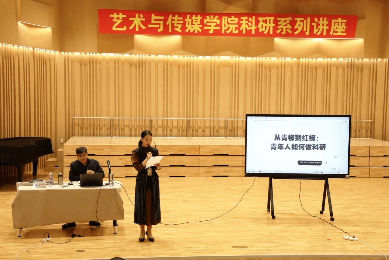 4月17日下午,艺术与传媒学院在校音乐厅举办“科研能力提升”系列讲座——《从青椒到红椒:青年教师科研成长之路》。此次讲座特邀河北师范大学新闻传播学院院长郭学军教授主讲,为学院教师科研能力提升“加油赋能”。郭学军教授深耕科研领域多年,学术积淀深厚、实践经验丰富,主持多项国家级、省级科研课题,在核心期刊发表论文40余篇,在科研申报与研究方面见解独到。